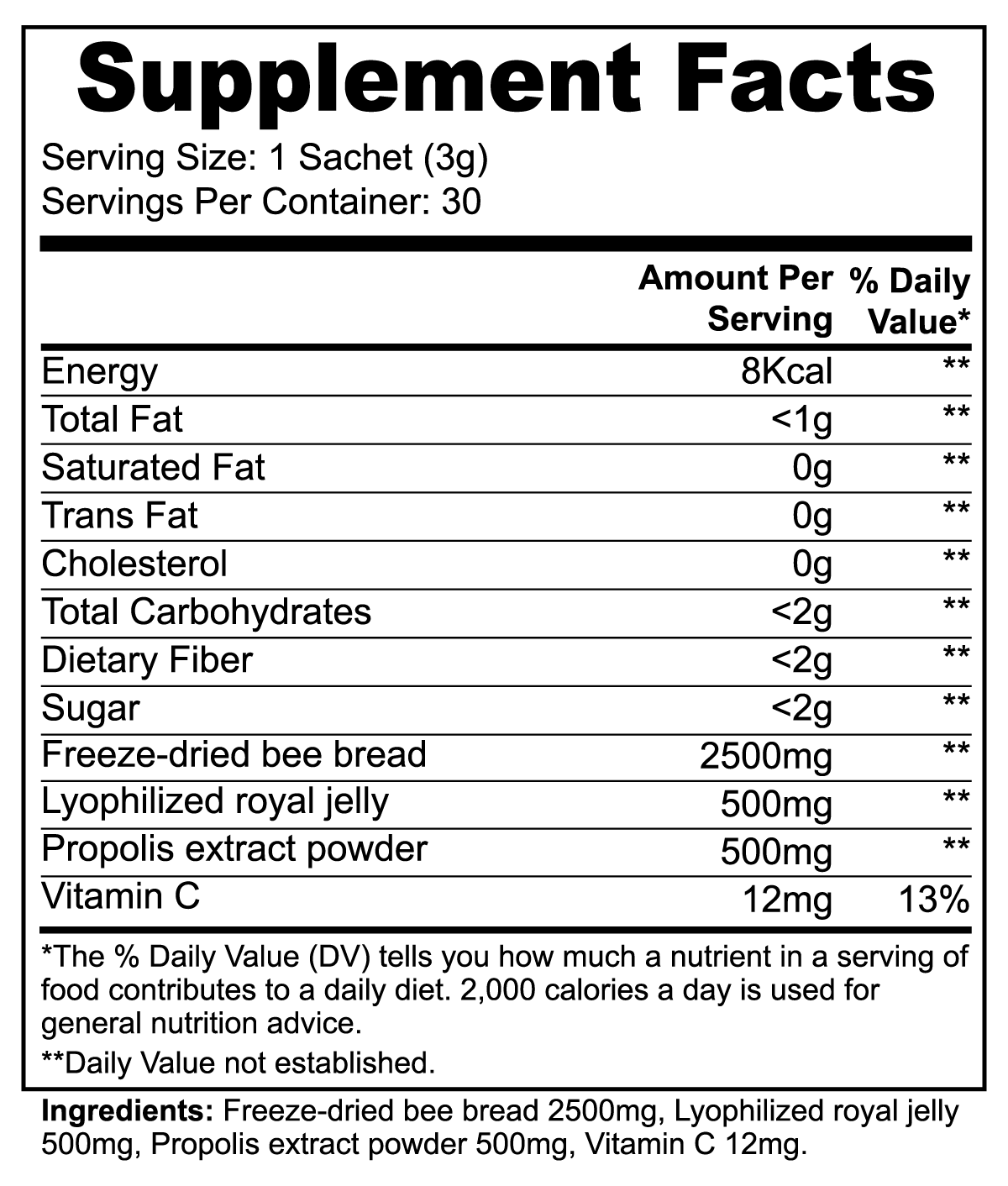 Ingredients: Freeze Dried Extract of Bee Bread, Lyophilized royal jelly, Propolis Extract Powder, Vitamin C.